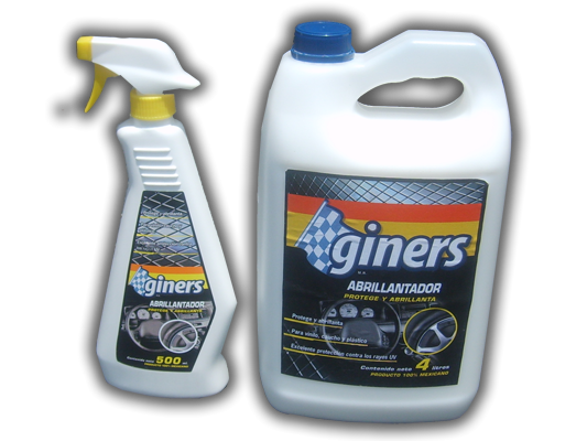Giners Abrillantador de Vinil es un producto especialmente desarrollado para dar protección y brillo a vinilos, plástico, llantas, tableros, defensas, asientos, teléfonos, molduras, etc. Está formulado con fluidos de silicona, antiestáticos, humectantes y emulsificantes no iónicos. No contiene solventes.